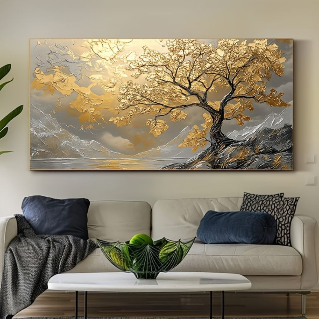 “Golden Breeze Tree” is a stunning handcrafted texture artwork depicting a majestic tree with shimmering golden leaves gently blowing in the wind. The elegant balance of black, grey, and gold makes it a luxurious and peaceful addition to any modern or classic living space. Its horizontal format is perfect for hanging above sofas, beds, or large hall walls.